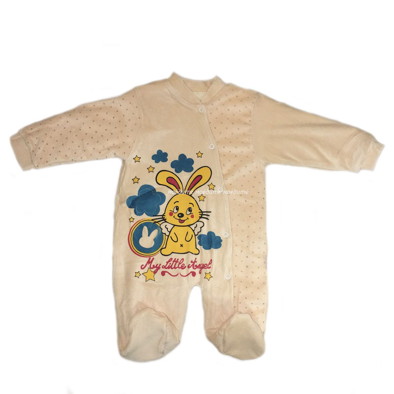 Комбинезон без капюшона, с закрытыми ножками, рукава на манжете, спереди на кнопочках от воротничка до конца ножки. Украшен спереди рисунком персонажей из мультиков.