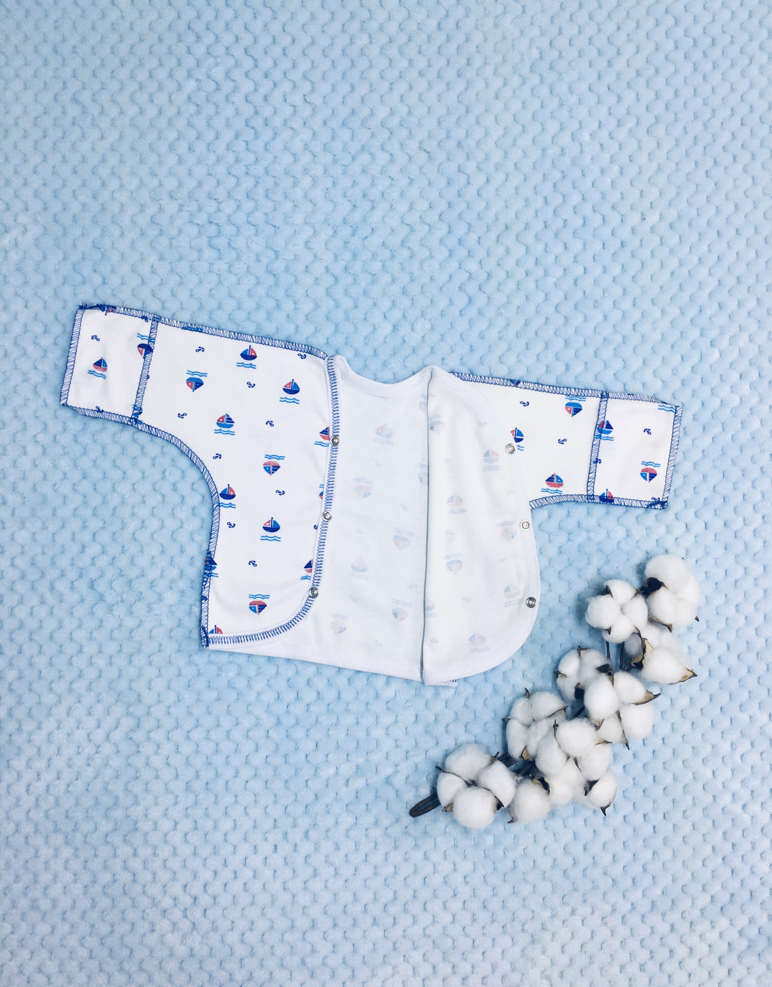 Распашонка выполнена со швами наружу, с рукавчиками-трансформерами, спереди с асимметричной застёжкой на кнопочках.